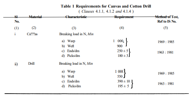 The upper shall consist of cotton fabric conforming to the requirements given in the table :