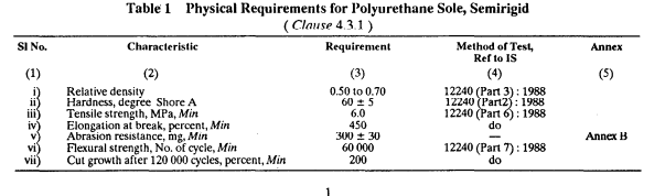 IS 13893:1994 is an Indian Standard, considering that, the details of the design aspect of soles and the composition of polyurethane mix have been kept out of the scope of this standard; prescribing only the essential physical requirements.