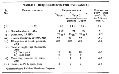 The PVC sandals shall be made from such basic materials that they comply with the physical requirements mentioned in the given table :