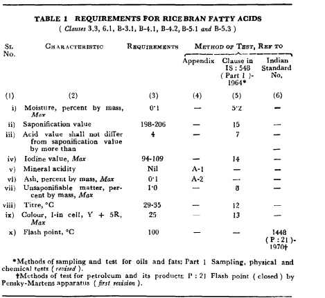 IS 12068: 1987, an Indian Standard, Considering that The rice bran fatty acids are produced by the hydrolysis of rice bran oil. Rice bran fatty acids contain 20 - 25 percent of saturated and 75 - 85 percent of unsaturated fatty acids.
