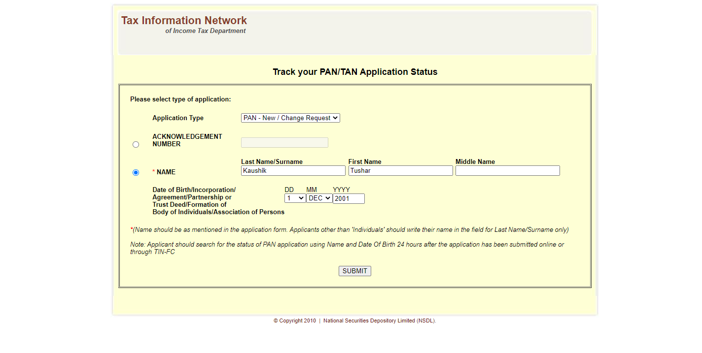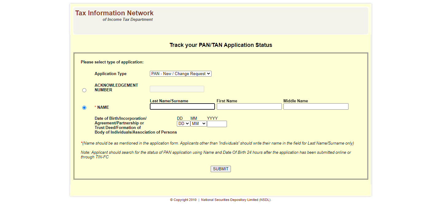 - Enter the application coupon number or PAN number, whichever is available along with Date of birth, /Incorporation / Agreement / Partnership, or Trust Deed / Formation of Body of Individuals / Association of Persons.