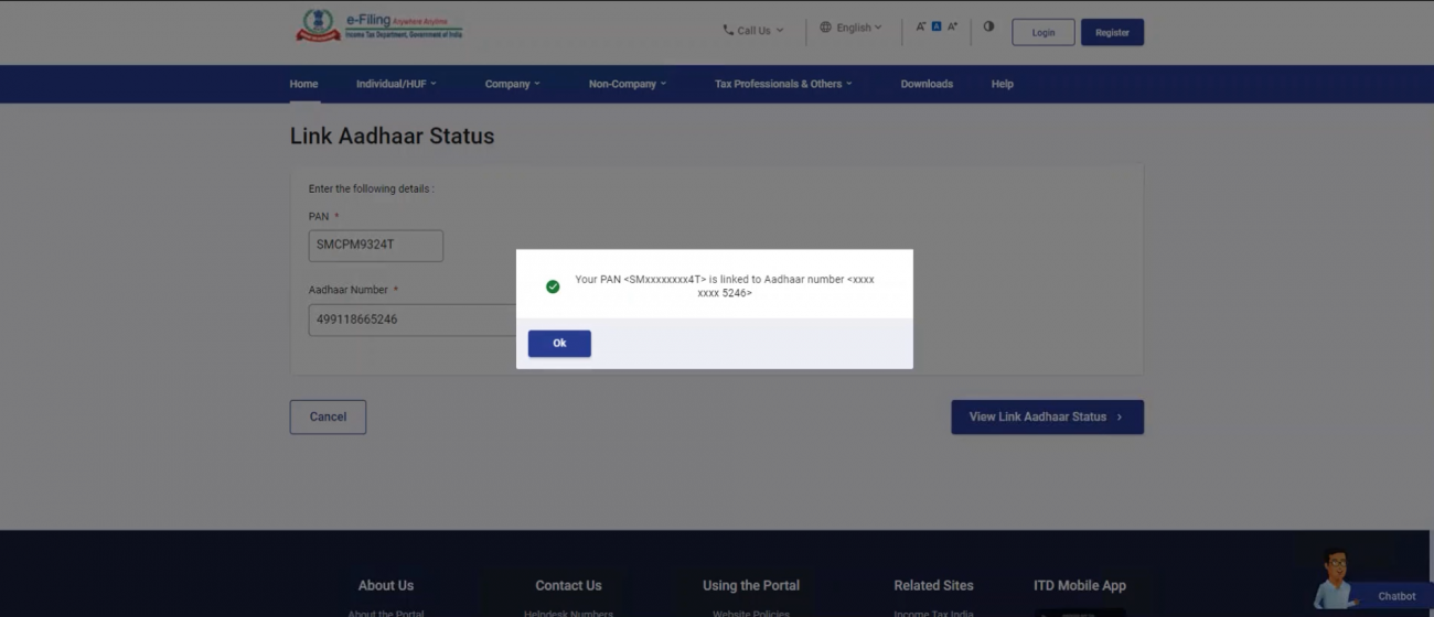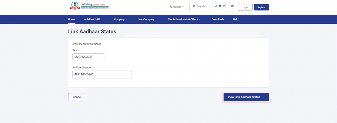 - Provide PAN and aadhar number, then click on “view link aadhar status.”