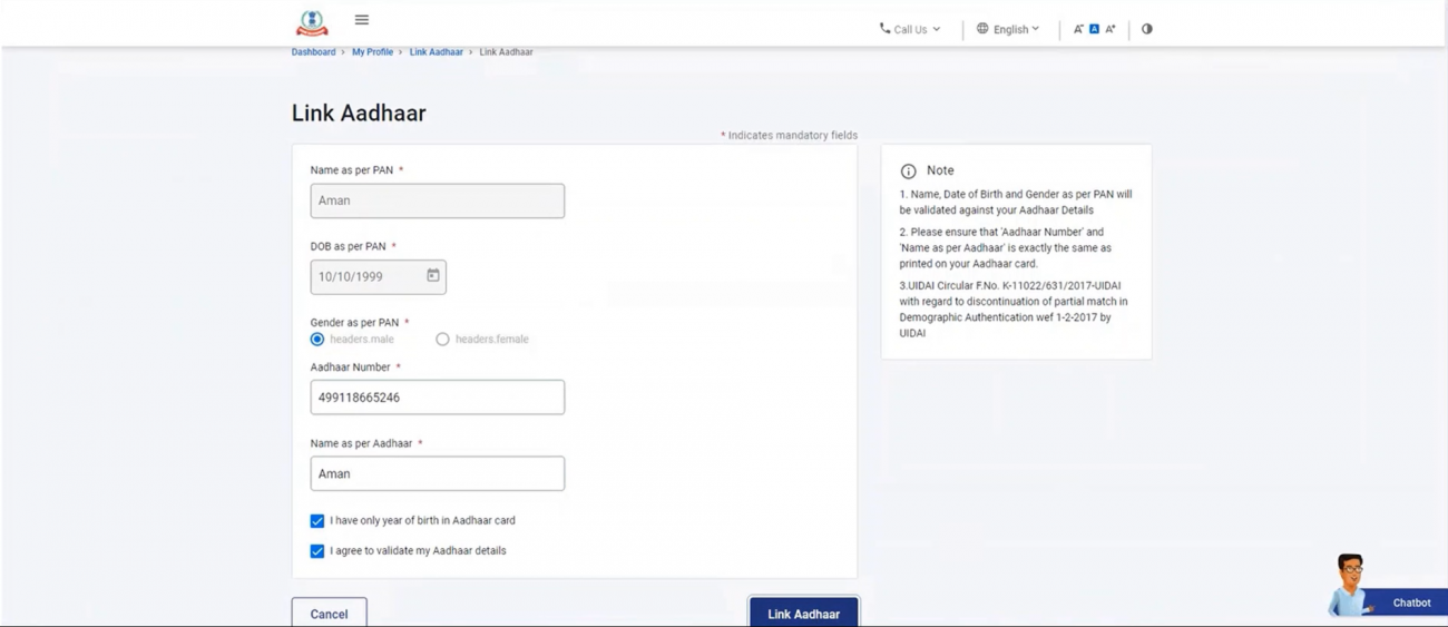 - Provide your aadhar number and name, as your name, date of birth and gender will be filed from the details provided in the PAN card.