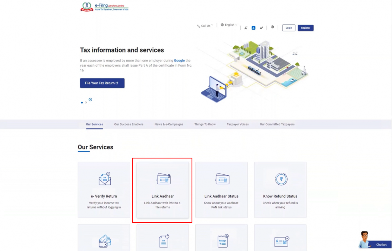 - Visit the official e-filing portal and click on, “Link aadhar.”